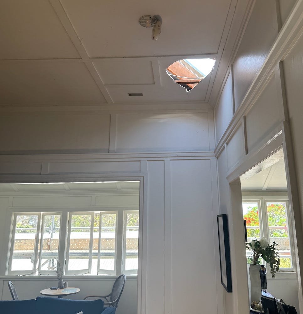 Slow day on the keyboard today because the house is full of tradies doing roof repairs. It’s an insurance claim, thank god, because it looks like a very, very spendy job. There’s at least a dozen guys, a crane, a shit ton of scaffolding and new roofing iron, new insulation, a new solar hot water system and… now… a new ceiling for my library after one of the roofers stepped through it.