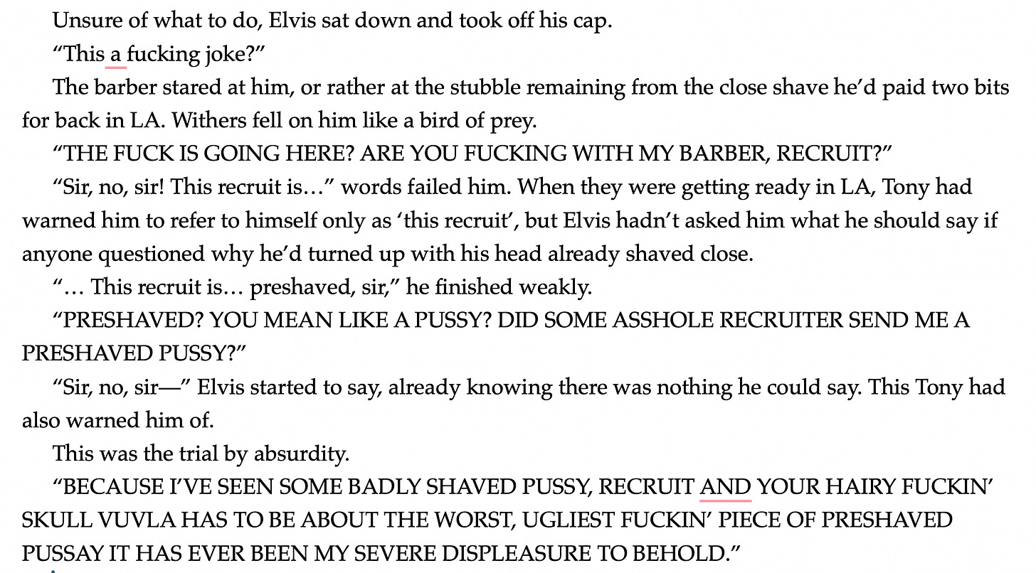 But I do still get a lot of joy out of writing, so much and so frequently that it surprises me. Only yesterday, I was hugging myself and chortling happily at a couple of lines of dialogue I’d written in World War 3.3. I’d sent Elvis off to Parris Island for Marine Corps boot camp, and of course he was being screamed at Full Metal Jacket-style by the drill instructors. I spent maybe an hour or so in the afternoon working out all of their screams of abuse. There was one in particular which I tweaked, and it just read so well to me after the tweak that I had to step back from the screen (I’m still using a standing desk, so I didn’t trip over the chair) and just stare happily at what I’d done.